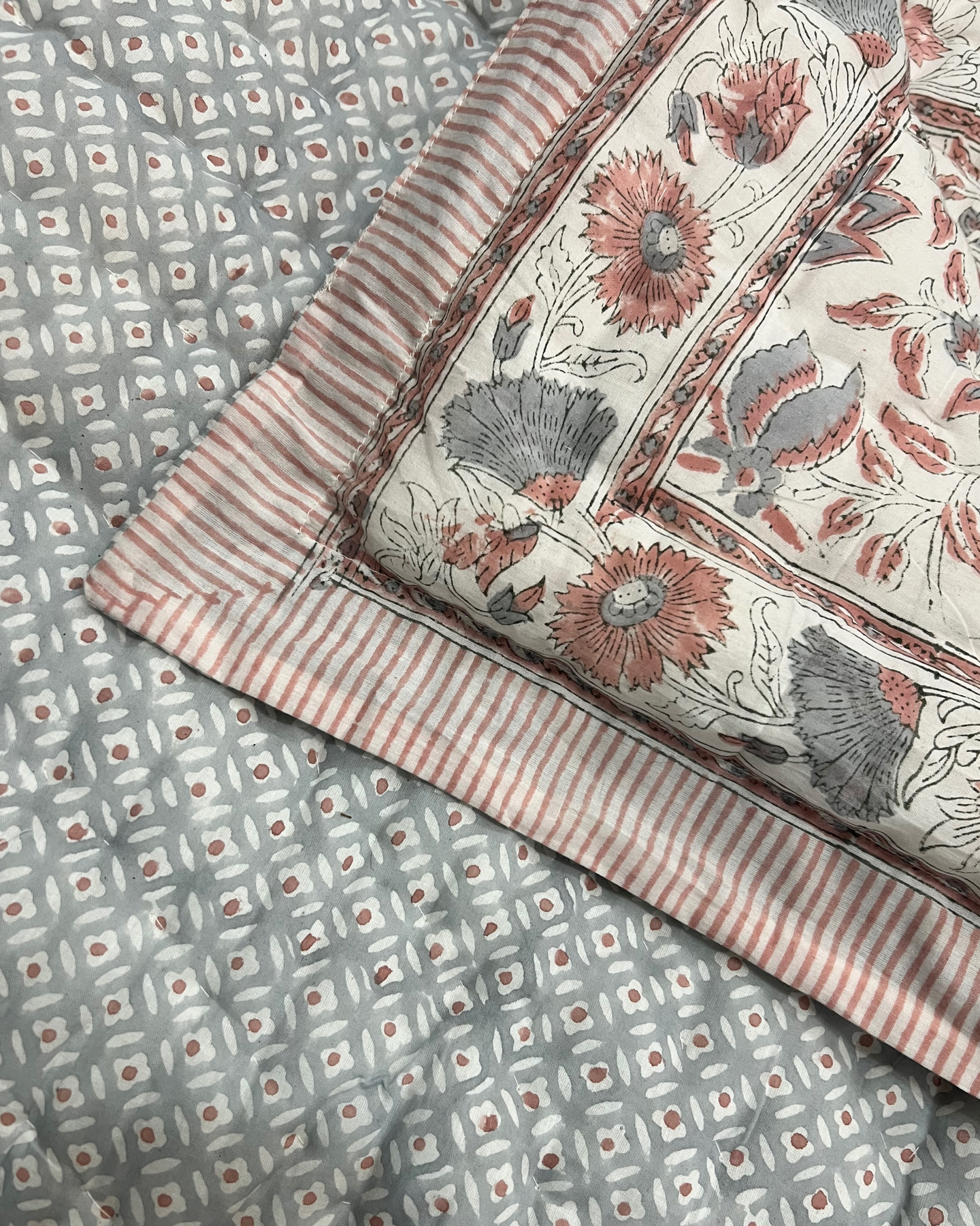 All our Dilli Grey throws are hand-block printed in limited runs, using traditional techniques. They are then lovingly filled with natural cotton filler and hand quilted. A labour of love that we hope shines through in these very special, heirloom textiles.