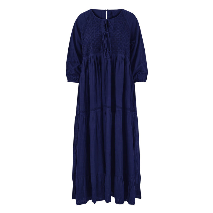 This sumptuously soft double-layered maxi dress has been one of our bestsellers consistently for 3 years and this year we have added a brand-new midnight blue colourway. Hand-embroidered by a women's co-operative outside Lucknow, using the traditional Chikankari style - no two dresses are the same.