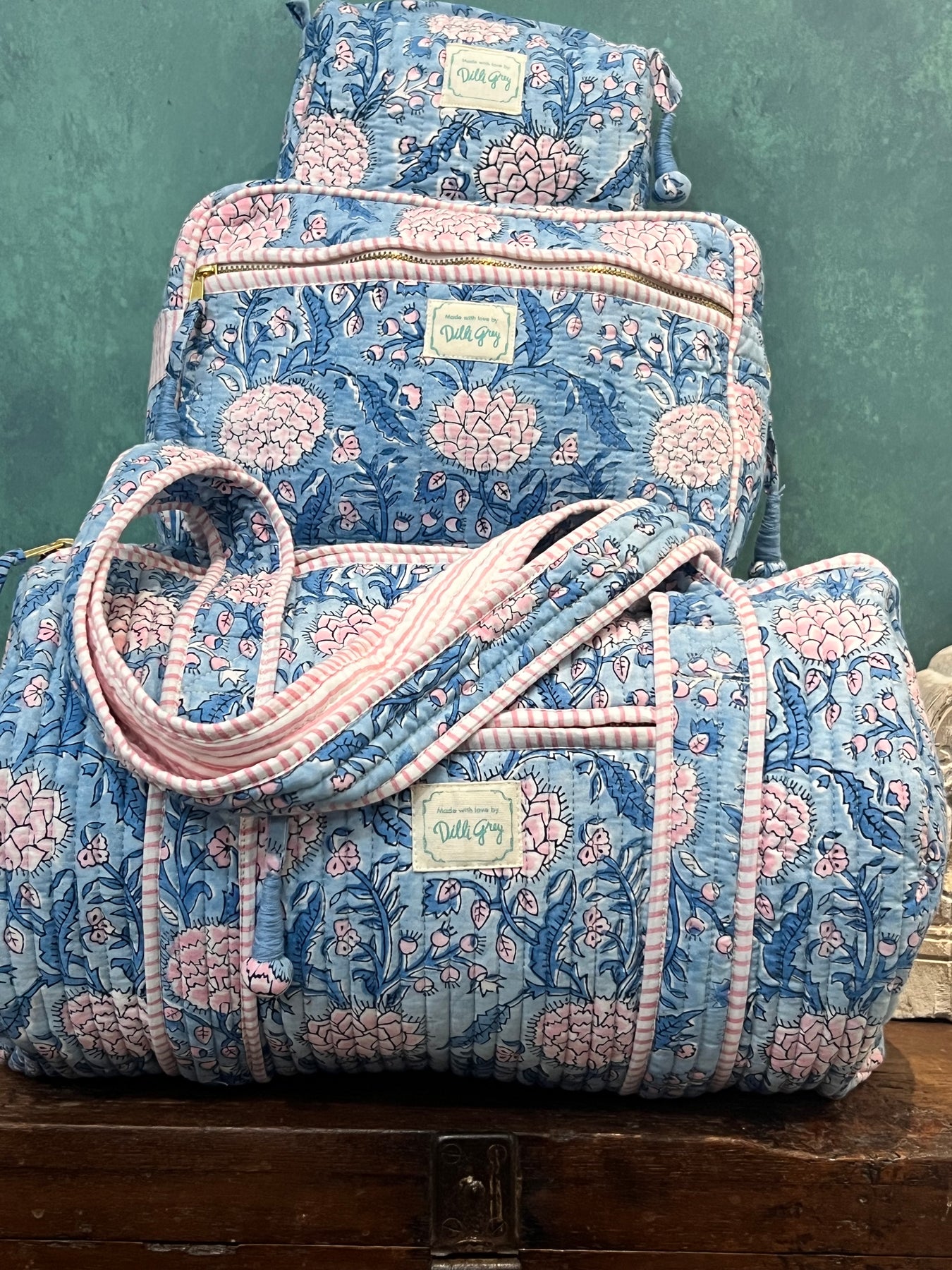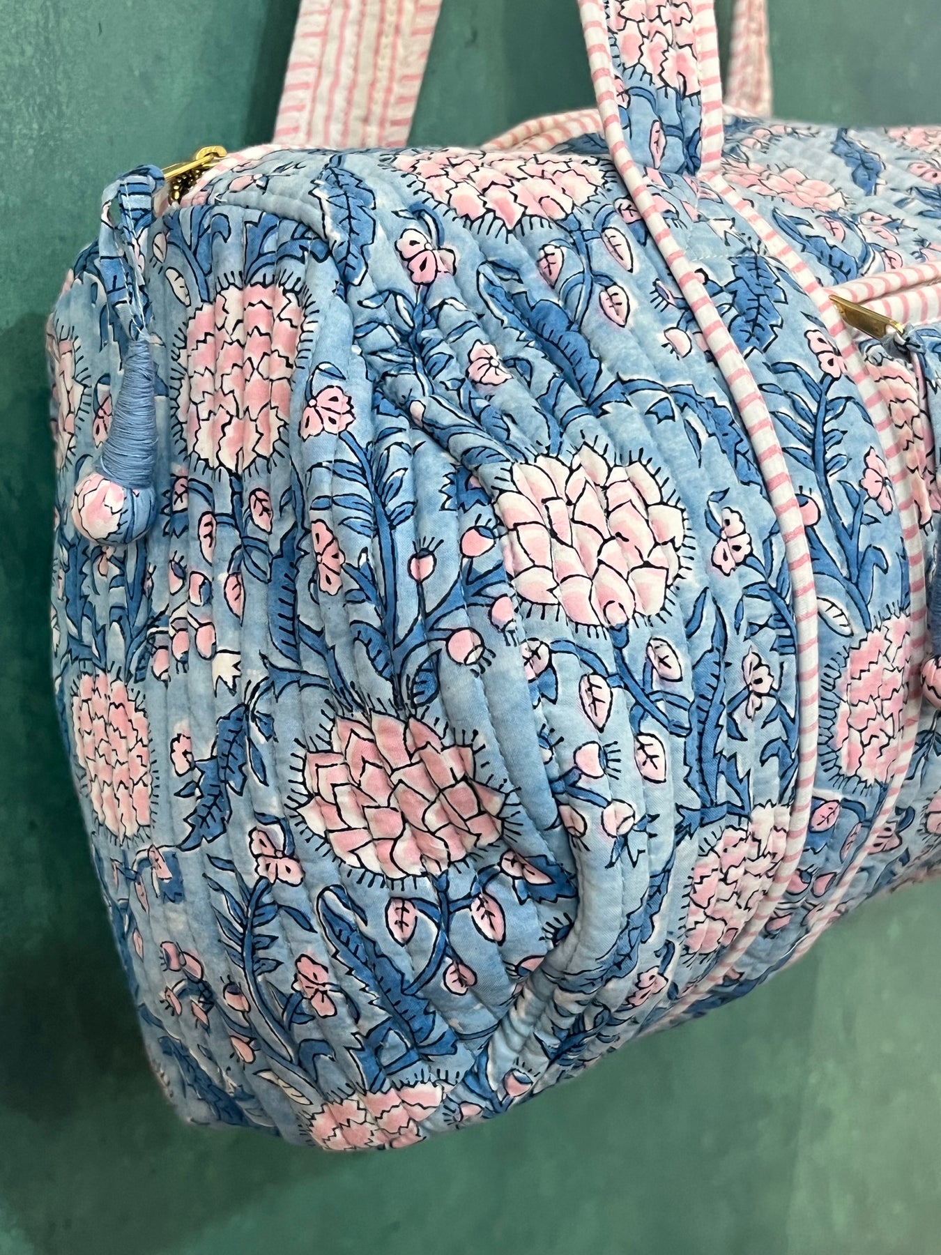 Our quilted bowling bag is now available in our Johari hand-block print in blue and pink.