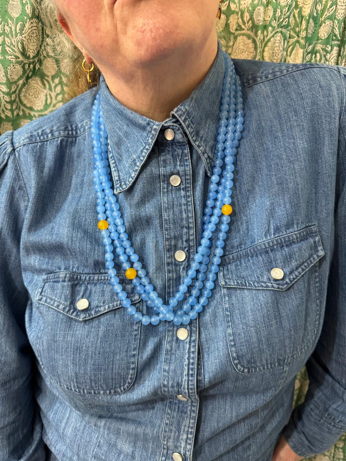Hand selected by our founder Vickie in Jaipur. This necklace is hand-made from blue calcedony round semi precious beads with one yellow onyx stone to give a unique look.