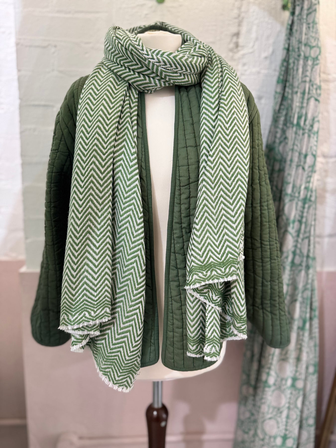 *NEW COLOUR* We have a new winter range of consciously sourced, 100% cashmere scarves. They are super-sized and great for really cocooning you in their soft, snuggly embrace. The perfect luxe gift in a new super luxe tone of taupe and tulsi green chevron design, which pairs beautifully with camels, khakis and other neutral tones.