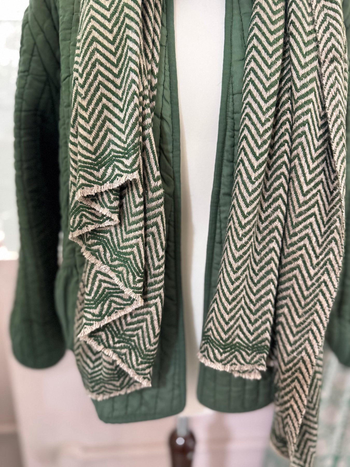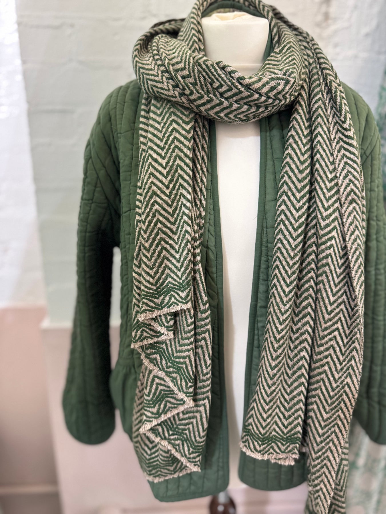 We have a new winter range of consciously sourced, 100% cashmere scarves. They are super-sized and great for really cocooning you in their soft, snuggly embrace. The perfect luxe gift in a new super luxe tone of taupe and tulsi green chevron design, which pairs beautifully with camels, khakis and other neutral tones.