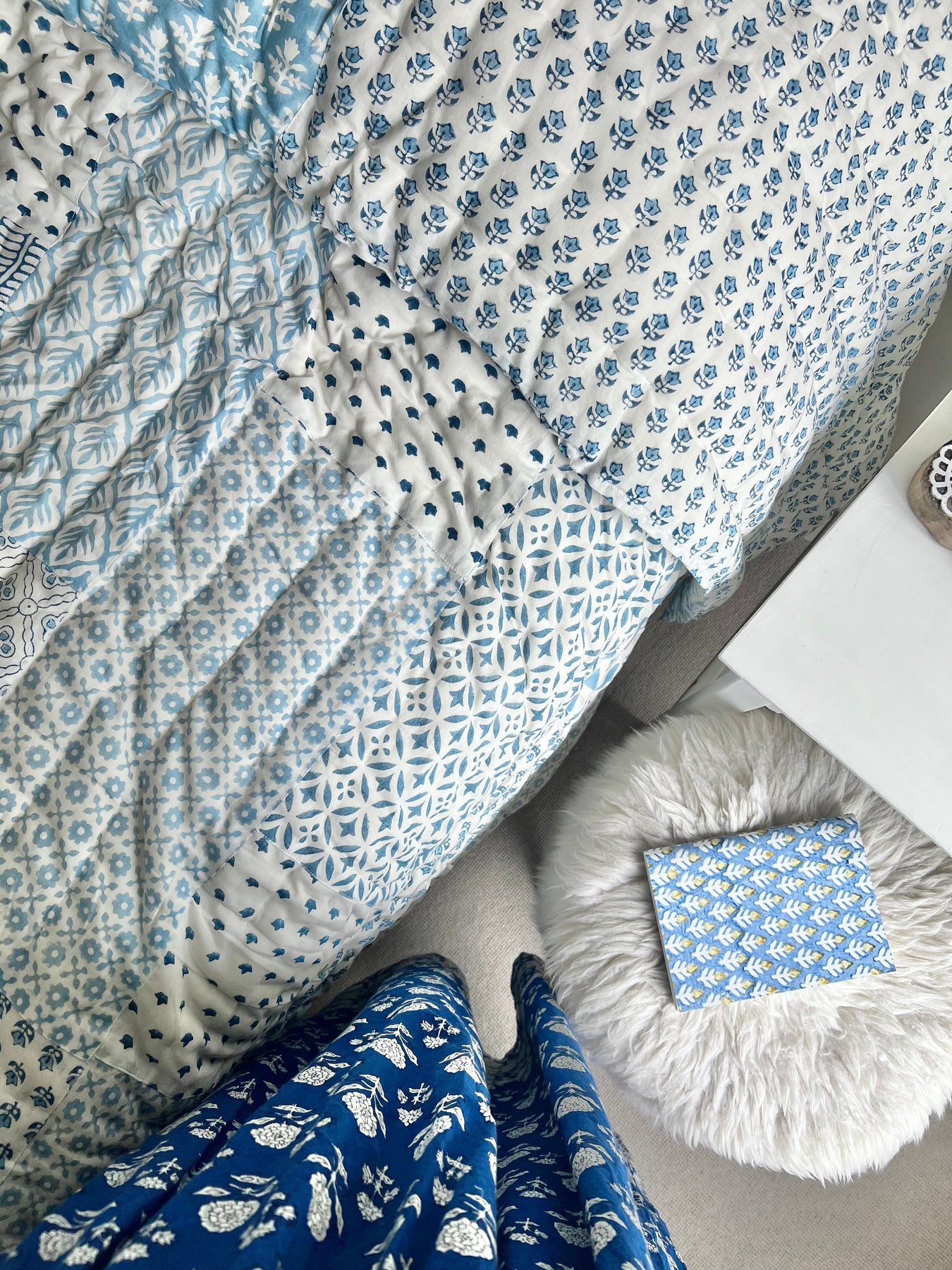 A beautiful tonal patchwork of blue and white tones, our new patchwork quilt showcases a mix of heritage block prints, all hand-printed on 100% organic cotton.